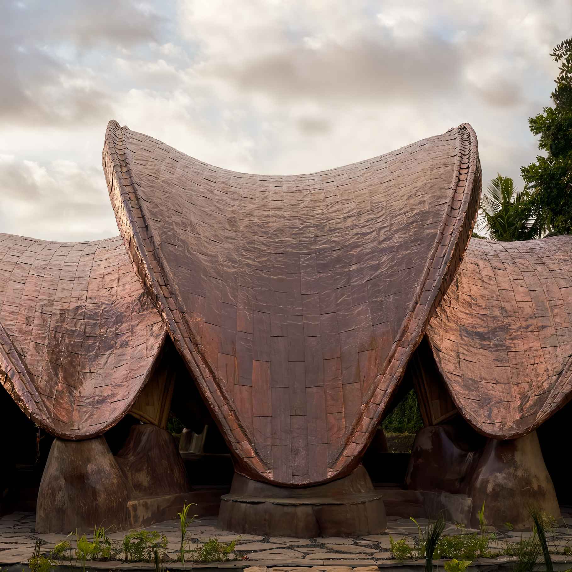 The Lumi Shala, encircled by supportive earthen walls, provides a comforting sense of enclosure, making it ideal for yoga practice. Bamboo arches, rising gracefully from mounded foundations, distinguish the structure, embodying a balance between grounding and extension akin to the human form. The five grid-shell roof petals are ingeniously arranged to allow gradients of natural light to permeate the space, creating an atmosphere conducive to introspection and focus.