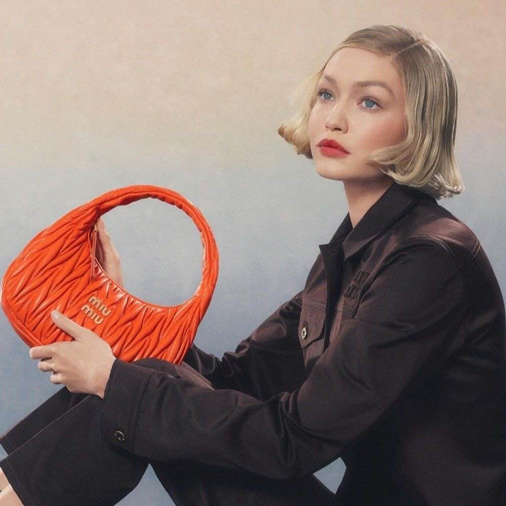 Starring Gigi Hadid as a modern reflection of the Miu Miu persona. MIU MIU unveils 2024 bag campaign photographed by Steven Meisel and starring Gigi Hadid. Here, those images are echoed in a respectful homage - we find a similar composure in crafting the image, the same saturated hues set against porcelain-delicate dégradé pastel, yet with the spontaneous spirit of now.